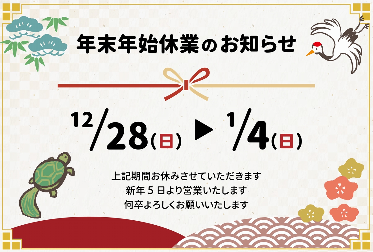 平素は格別のお引き立てを賜り厚く御礼申し上げます。 さて、誠に勝手ではこざいますが、当社の年末年始休業につきまして 下記の通り休業とさせていただきますので、ご案内申し上げます。 何卒ご理解頂きますようお願い申し上げます。…